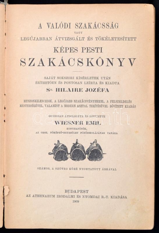 St. Hilaire Jozéfa: Képes pesti szakácskönyv. Átdolgozta és bővítette: Wiesner Emil. Bp.,1909, Athenaeum, XIX+484 p. Kiadói félvászon-kötésben, kopott borítóval, hiányos gerinccel, de belül a lapok tiszták, épek.