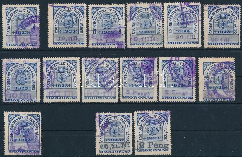 Leírás: 15 db Csongrád városi okmánybélyeg, közte 60f és 2P fekete felülnyomással