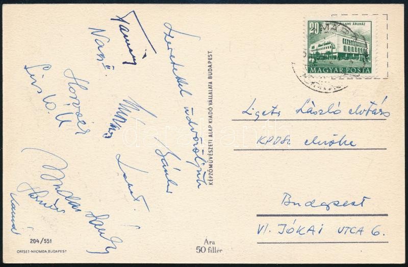 1955 Vörös Meteor labdarúgói által aláírt képeslap, (Budai I. László, Lakat, Mészáros, Nagy II, Horváth, Lipták) Ligeti László KPDSZ (Kereskedelmi és Pénzügyi Dolgozók Szakszervezete) elnök részére.