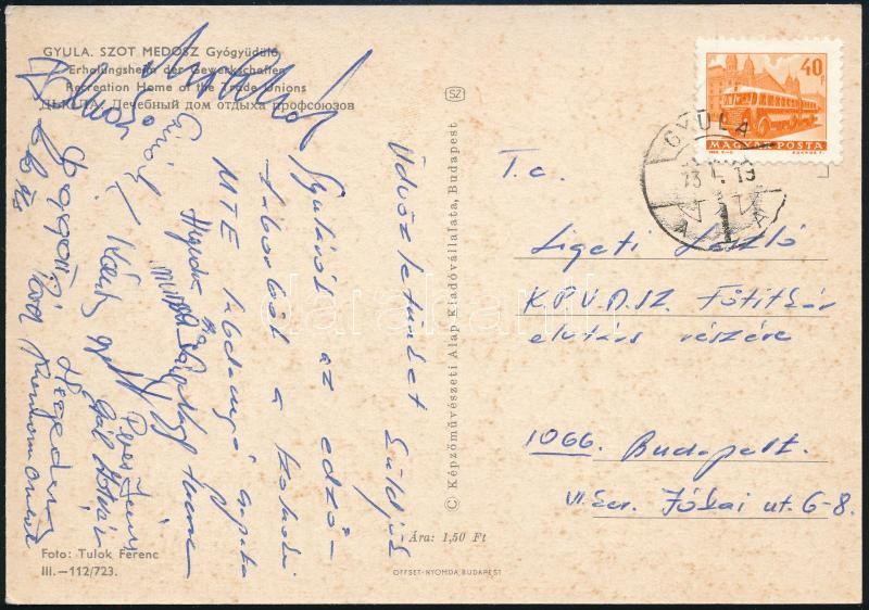 1973 Szolnoki MTE labdarúgói által aláírt képeslap (Nagy, Gál, Hegedűs, Kántor Mihály, Czirnák, Papp II.,Thomann Antal (edző)) Ligeti László KPDSZ (Kereskedelmi és Pénzügyi Dolgozók Szakszervezete) főtitkár részére.