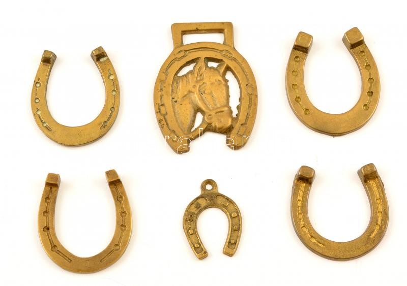 Leírás: 5 db kisméretű réz lópatkó dísz + 1 db lovas-lópatkós sörnyitó; különböző méretben