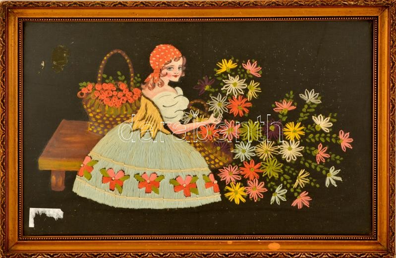 Leírás: Lány virágokkal, hímzett falikép, üvegezett keretben, 24×37 cm