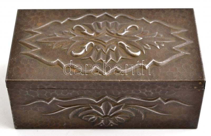 Leírás: Szecessziós fém doboz, fa betéttel, 14,5×8 cm