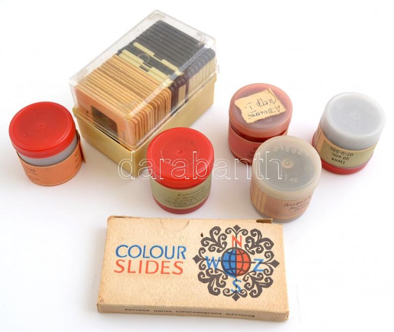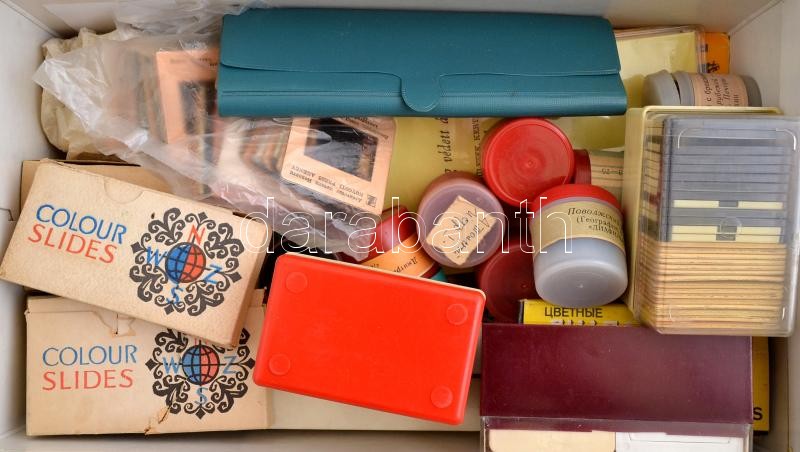 Leírás: Vegyes cipősdoboznyi, többségében szovjet diafilm és dia. Változó állapotban.