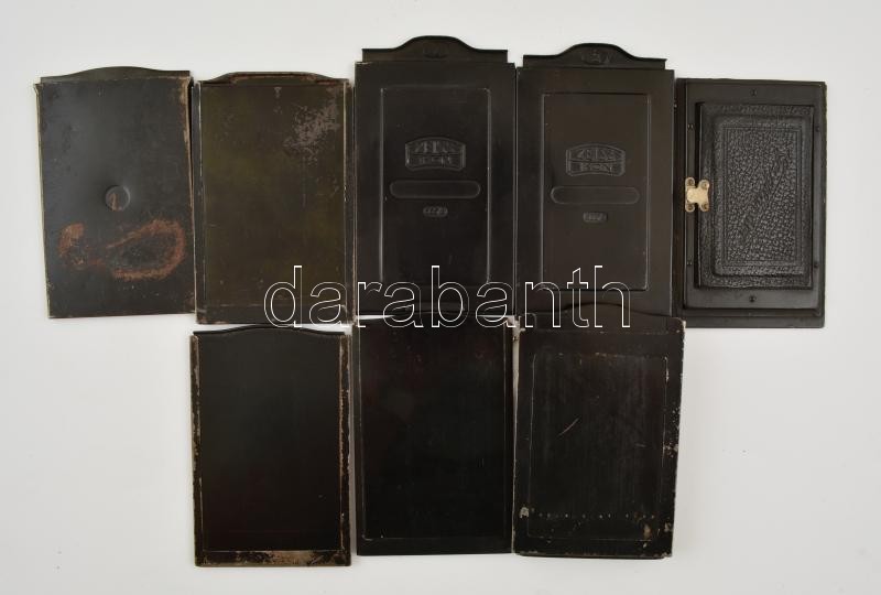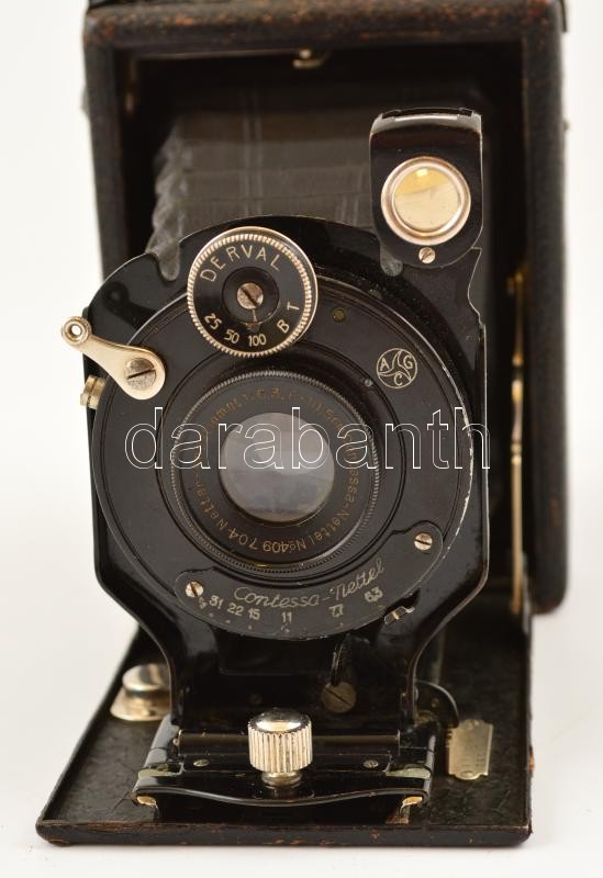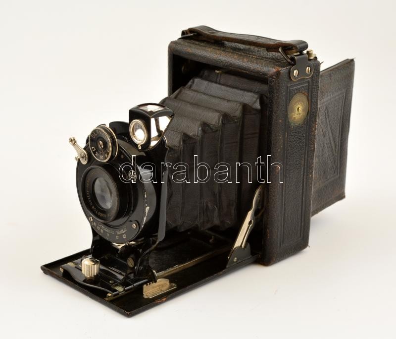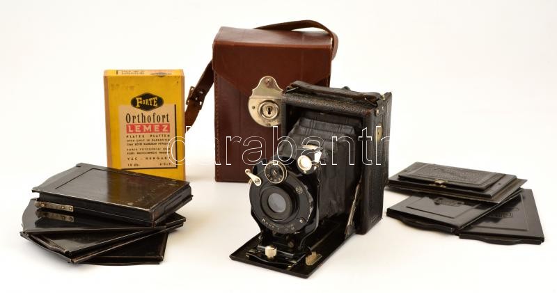 Contessa-Nettel Suevia fényképezőgép Nettar-Anastigmat f:6,3 F=10,5 cm objektívvel, a sín kicsit szorul, egyébként jó állapotban, saját bőr tokjában + 5 db fém síkfilm kazetta + Forte Orthofort lemezek (6,5×9 cm, 10 db), bontatlan csomagolásban