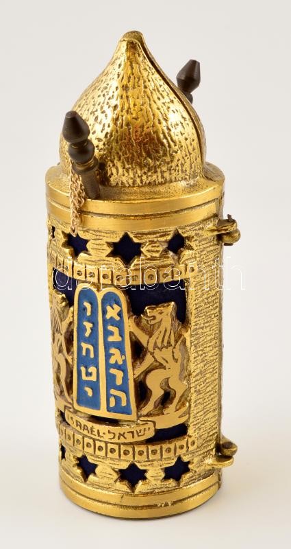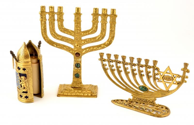 Leírás: Vegyes judaika tétel: 2 db réz menóra (az egyik hanukai), 1 db Tóratekercs-tartó (tekerccsel)