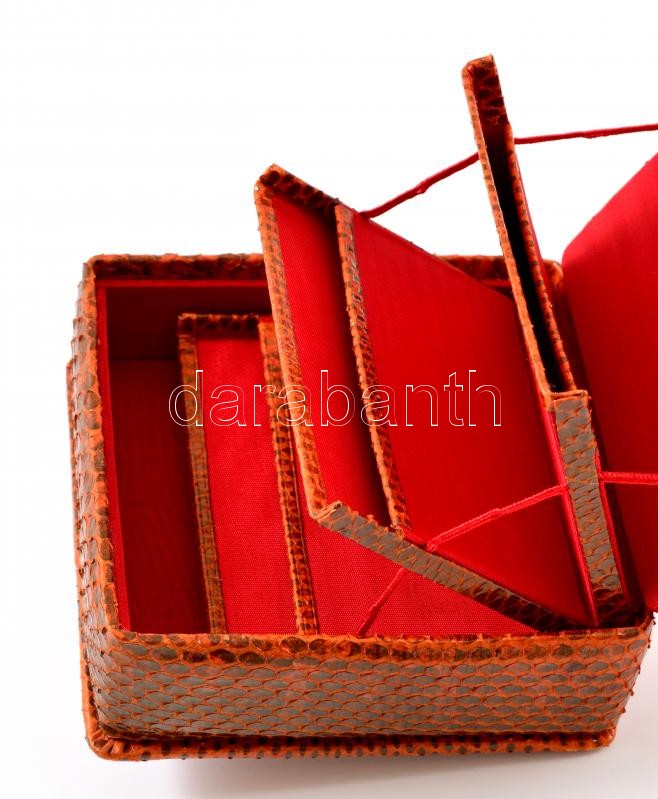 Leírás: Kígyóbőrőből készült névjegytartó doboz több rekesszel. Szép, újszerű állapotban. / Snake leather name card holder 12x12x5 cm