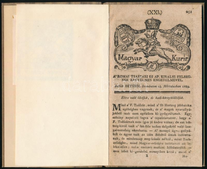 Leírás: 1789 A Magyar Kurír március 14. száma modern védőborítóba kötve