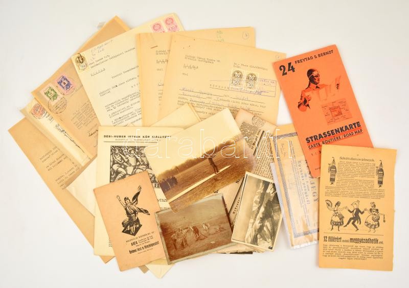 Leírás: 1845-1986 Vegyes papírrégiség tétel, kb. 30-40 db, fotók, német nyelvű újságok, marha levél, térkép, kérelmek..stb.