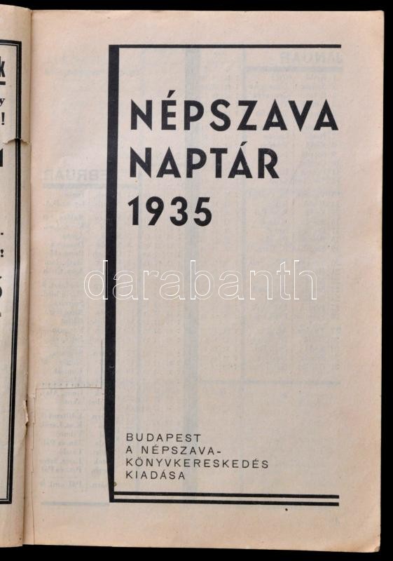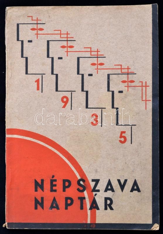 1935 Népszava naptár. A borító Dukai Károly (1888-?) munkája. Bp., Világosság-ny.,120 p. Kiadói illusztrált, kétszínnyomásos, avantgárd papírkötésben, hiányos (56/57.,120 oldaltól), a címlapon hiánnyal. Többek közt Szakasits Árpád, Vámbéry Rusztem, Mónus Illés, Kéthly Anna, Pap Károly, Hatvany Lajos, Illyés Gyula, Kassák Lajos, Buchinger Manó és mások írásaival.