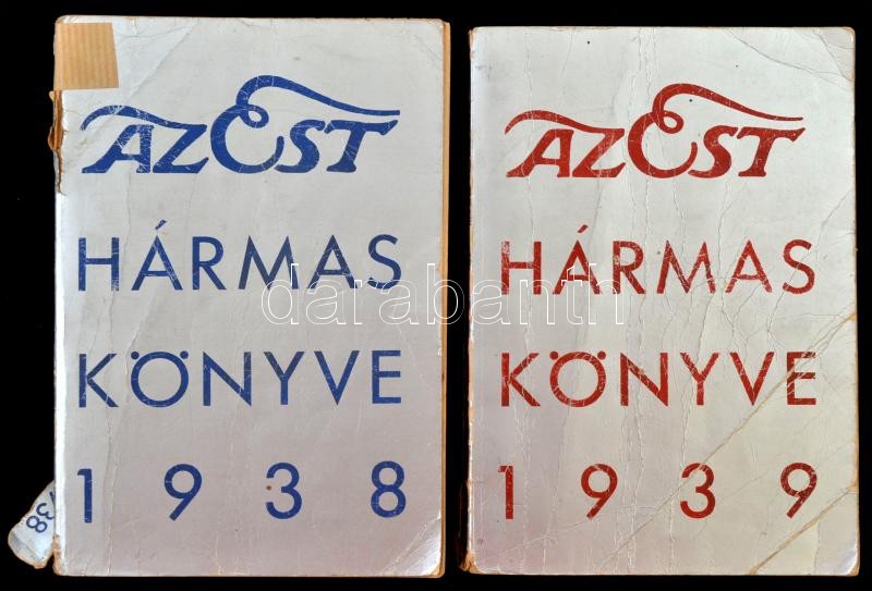 1938-1939 Az Est Hármas könyve 1938+1939. Papírkötésben, az egyik borí... https://www.darabanth.com/hu/350-Gyorsarveres/350.0/Mutargy-papirregiseg-egyeb/Nyomtatvanyok~31/1938-1939-Az-Est-Harmas-konyve-1938plus1939-Papirkotesben-az-egyik-boritoja-gyurott-a-masi~II1830463