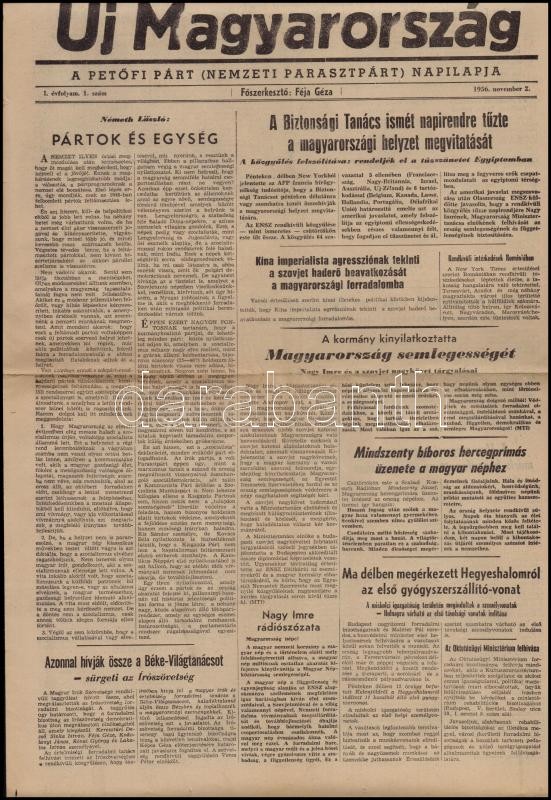 Leírás: 1956 Új Magyarország. A Petőfi Pár (Nemzeti Parasztpárt) napilapja. I. évf. 1. sz. 1956. nov. 2. Szerk.: Féja Géza, 4 p.