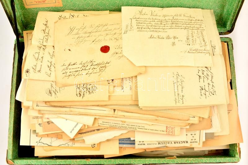 Leírás: Komoly régi papírhagyaték tétel vintage bőröndben csurig telve