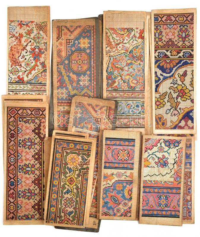 Leírás: cca 1930-1950 23 db szőnyegminta, kartonon és 2 db faroston, kopott kartonokkal, néhol bejegyzésekkel, 23x9 cm és 36x12 cm közötti méretben.