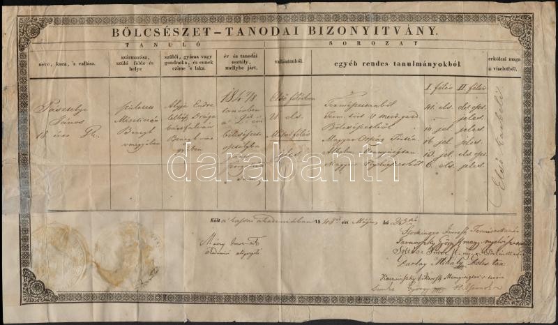 1848 Kassa, Bölcsészettanodai bizonyítvány, ragasztott https://www.darabanth.com/hu/350-Gyorsarveres/350.0/Mutargy-papirregiseg-egyeb/Okmanyok~17/1848-Kassa-Bolcseszettanodai-bizonyitvany-ragasztott~II1990121