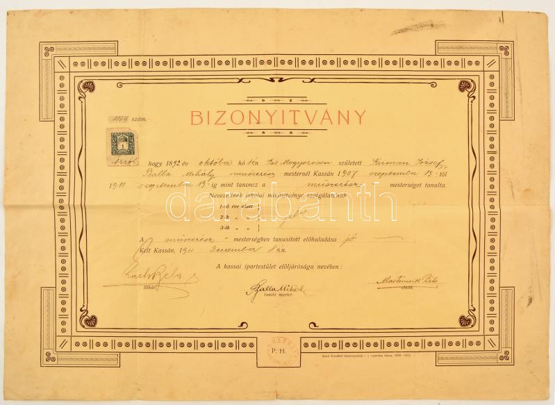 1911 Kassa, Műszerésztanonc számára kiállított bizonyítvány https://www.darabanth.com/hu/350-Gyorsarveres/350.0/Mutargy-papirregiseg-egyeb/Okmanyok~17/1911-Kassa-Muszeresztanonc-szamara-kiallitott-bizonyitvany~II1990102