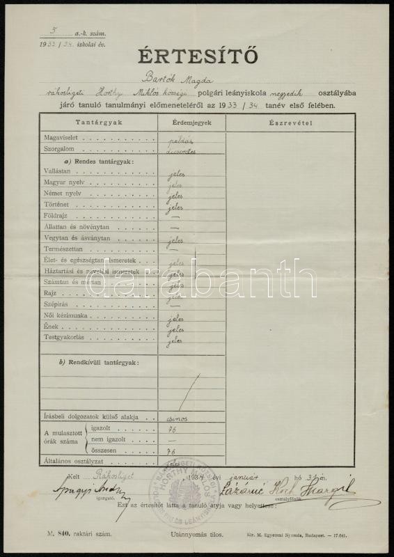 Leírás: 1926-1939 5 db iskolai értesítő-könyvecske, valamint egy polgári leányiskolai értesítő, valamint egy polgári leányiskolai bizonyítvány.