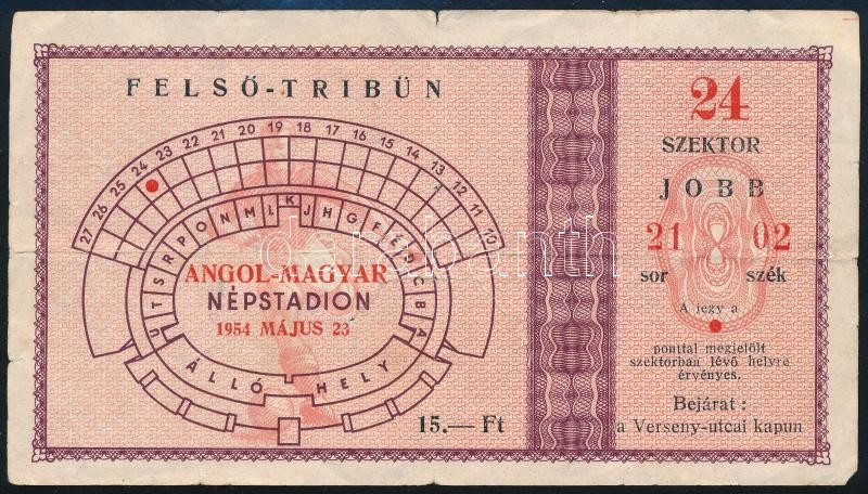 1954 belépőjegy a Népstadionba az Angol-Magyar football-mérkőzésre (a meccs a híres 6:3 visszavágója volt és Magyarország 7:1 arányban nyert). / Ticket for the football match Hungary vs England. The aftermath of the London triumph of the Golden Team