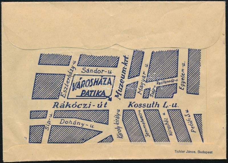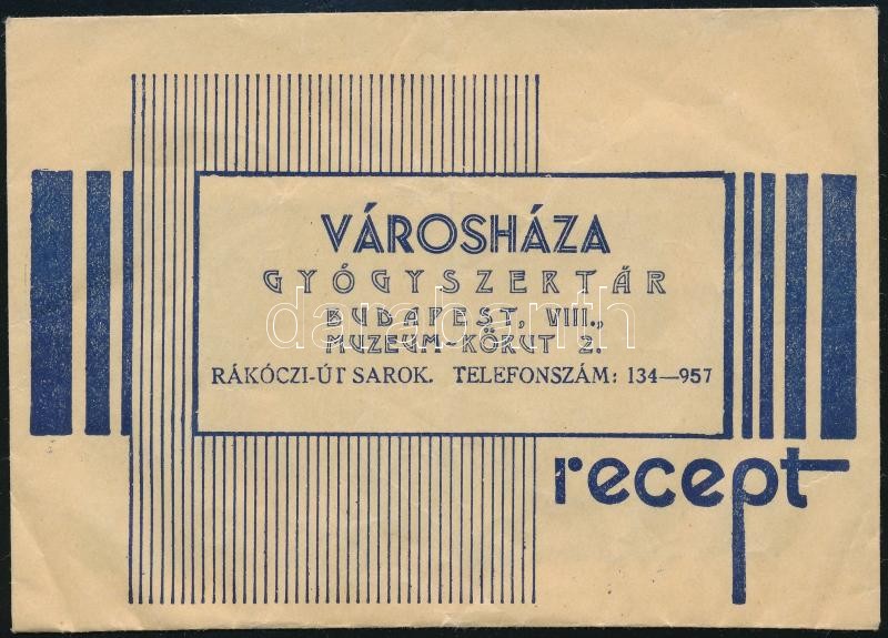 Leírás: Patakfalvy Sándor Városháza Gyógyszertár receptborítékja (Bp. Múzeum körút 2. Rákóczi úti sarok)