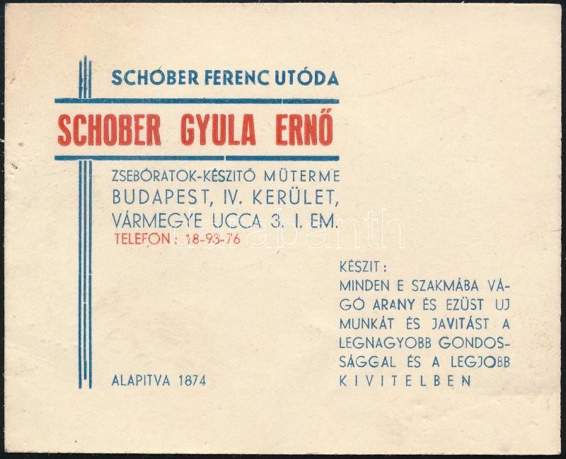Schober Gyula Ernő zsebóratok-készítő Budapest IV. reklámkártyája, hát... https://www.darabanth.com/hu/350-Gyorsarveres/350.0/Mutargy-papirregiseg-egyeb/Reklam~21/Schober-Gyula-Erno-zseboratok-keszito-Budapest-IV-reklamkartyaja-hatoldalon-szamlajegyzC3~II1990899