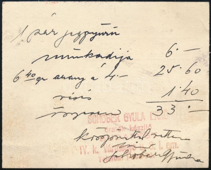 Leírás: Schober Gyula Ernő zsebóratok-készítő Budapest IV. reklámkártyája, hátoldalon számlajegyzékkel