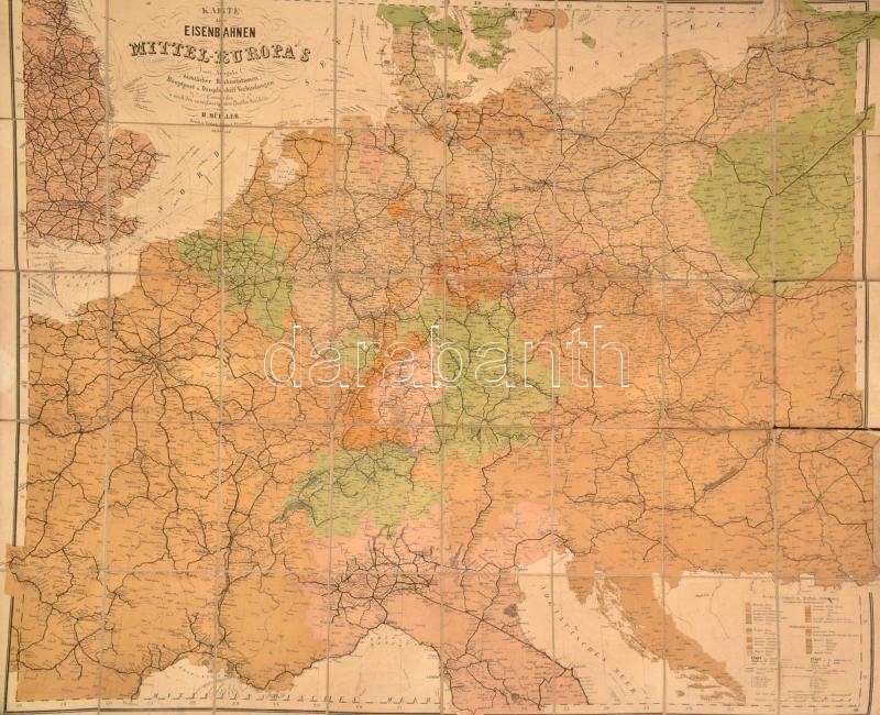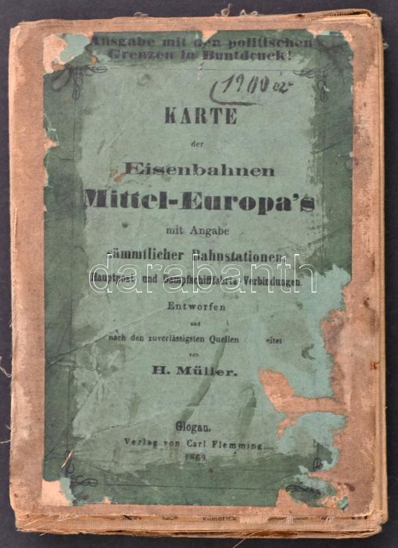 1869 1869 Közép-Európa vasúti térképe, Karte der Eisenbahnen Mittel-Europa's mit Angabe sämmtlicher Bahnstationen, Hauptpost- und Dampfschiffahrts Verbindungen.Glogau, Carl Flemming, vászonra kasírozva, szakadással, 81x98 cm.