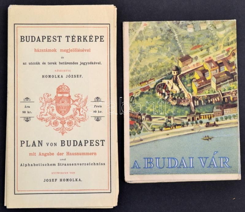 1983 Homolka József: Budapest térképe házszámok megjelölésével és az utcák és terek betürendes jegyzékével. / Plan von Budapest mit Angabe der Hausnummern und Alphabetischem Strassenverzeichniss. Bp., 1983, Kartográfiai Vállalat. Az 1896-os kiadás (Bp., Eggenberger) reprintje, 67×57 cm+1960 Budai vár. Bp., Kartográfiai Vállalat, 32x44 cm