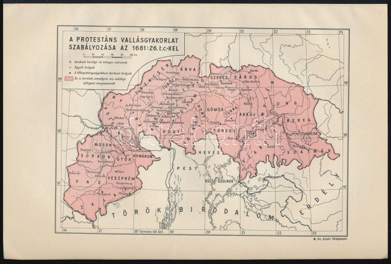 Leírás: A protestáns vallásgyakorlat szabályozása az 1681:26 törvénycikkel, kiadja: M. Kir. Állami Térképészet, 15×23 cm