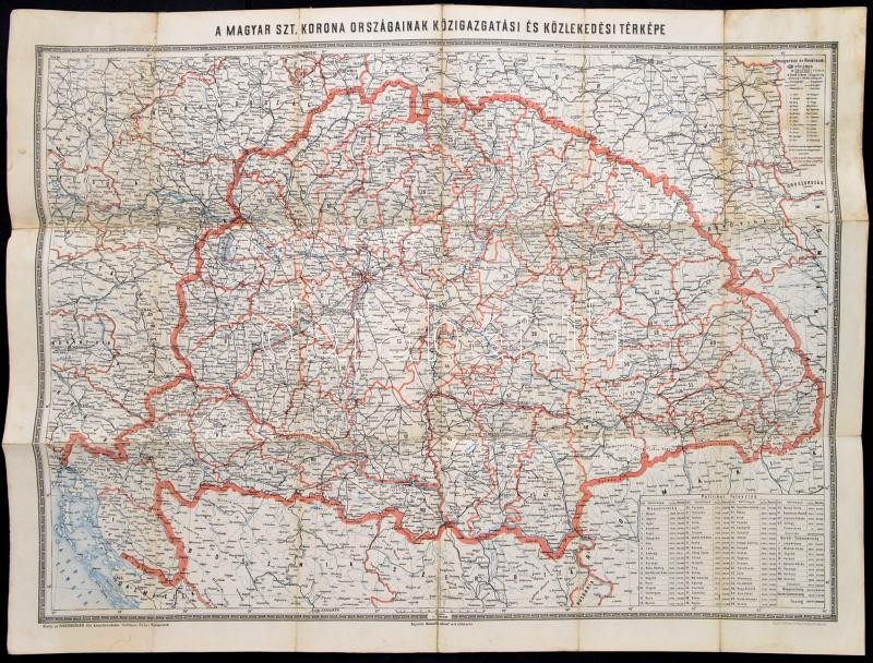 cca 1910 A Magyar Szt. Korona Országainak közigazgatási és közlekedési térképe, 1:1300.000. Rajzolta: Homolka József. Bp., Eggenberger, (Kellner és Mohlrüder-ny.), restaurált, 60x81 cm