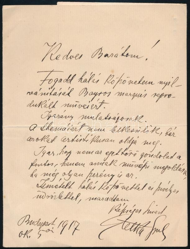 1917 Stella Gyula (1884-1931) szÃnész, VÃgszÃnház (1911-tÅ‘l), majd a Nemzeti SzÃnház (1921-tÅ‘l) tagjának saját kézzel Ãrt levele Dr. Siklóssy László (1881-1951) országgyűlési gyorsÃró (1899.-tÅ‘l), Országgyűlési Gyorsiroda késÅ‘bbi vezetÅ‘jének (1933-1951), Ãró, ügyvéd, művelÅ‘déstörténész, esztéta, újságÃró és szerkesztÅ‘ részére, borÃtékkal.