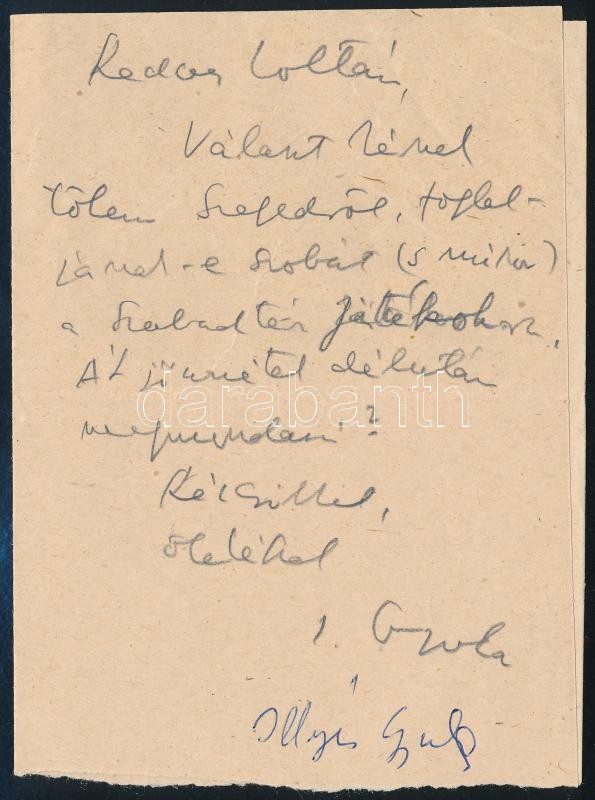 Illyés Gyula (1902-1983) saját kézzel írt levélkéje Vas Zoltán (1903-1... https://www.darabanth.com/hu/350-Gyorsarveres/350.0/Mutargy-papirregiseg-egyeb/Tortenelmi-dokumentumok-keziratok-erdekessegek~18/Illyes-Gyula-1902-1983-sajat-kezzel-irt-levelkeje-Vas-Zoltan-1903-1983-iro-56-os-alla~II1989524