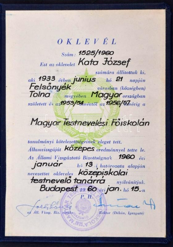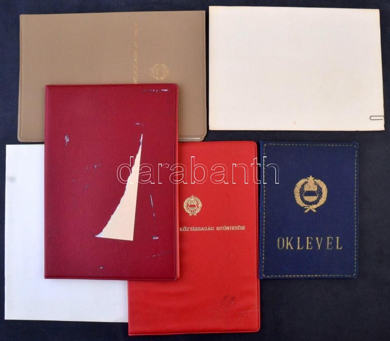 Vegyes több darabos adományozói oklevél és viselői igazolvány tétel, valamint egy érettségi bizonyítvány és testnevelő tanári oklevél az ötvenes évekből, közte "Bányász Szolgálati Érdemérem" bronz fokozata (2x) kitüntetés adományozói okirattal T:2