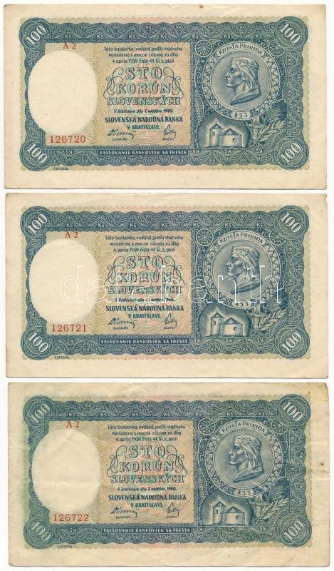 Slovakia 1940. 100 Korun (3x) sequential serials, 2nd issue C:F