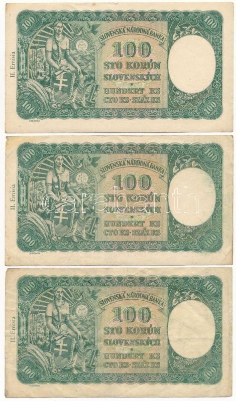 Slovakia 1... https://www.darabanth.com/hu/350-Gyorsarveres/350.0/Numizmatika/Kulfoldi-bankjegyek~2500073/Szlovakia-1940-100K-3x-sorszamkovetok-II-kiadas-TIII-Slovakia-1940-100-Korun-3x-seque~II1992641