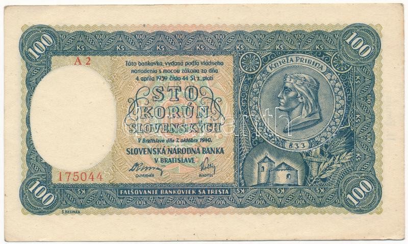 Slovakia 1940. 100 Korun 2nd issue C:F