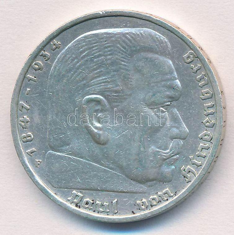 Germa... https://www.darabanth.com/hu/350-Gyorsarveres/350.0/Numizmatika/Kulfoldi-fem-es-ezustpenzek~1000014/Nemet-Harmadik-Birodalom-1936F-5M-Ag-Hindenburg-T2-German-Third-Reich-1936F-5-Mark-Ag-Hindenbu~II1979839