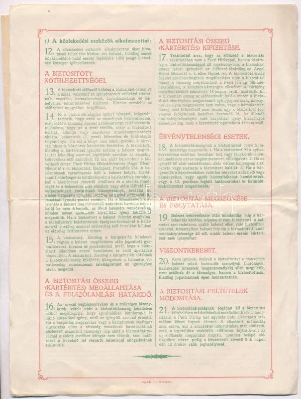 Bia 1929. A Pesti Hírlap előfizetőinek szóló baleset biztosítási okmány 10.000P értékben, a Angol Elemi Biztosító Rt. reklám nyomtatványával és egy feladóvevénnyel T:II-