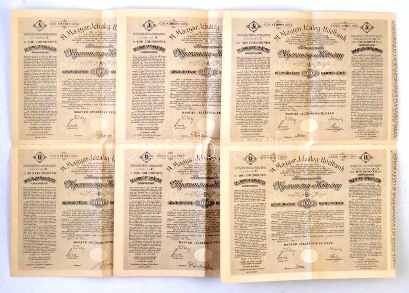 Leírás: 1906. "A Magyar Jelzálog-Hitelbank" nyereménykötvénye ívben, "A" és "B" együtt 100K-ról, 3 nyelven (3x) T:III szép papír