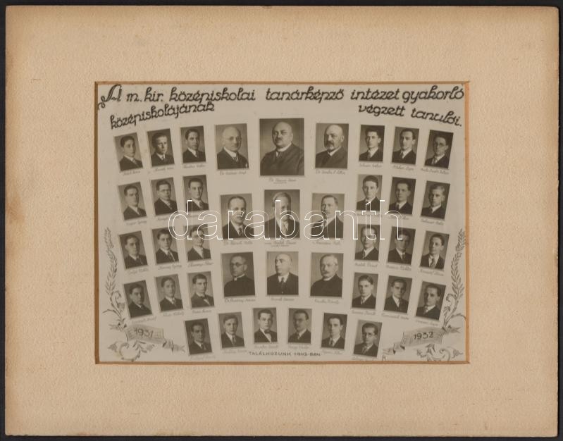 1932 A m. kir. középiskolai tanárképző intézet gyakorló középiskolájának tanárai és végzett tanulói, kistabló nevesített portrékkal, 16x21,5 cm, karton 24,5x32 cm