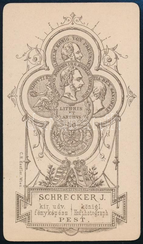 Leírás: cca 1864 Schrecker J. pesti fényképész műtermében készült, vizitkártya méretű fénykép, ritkán felbukkanó hátoldali grafikával, 10,5x6 cm