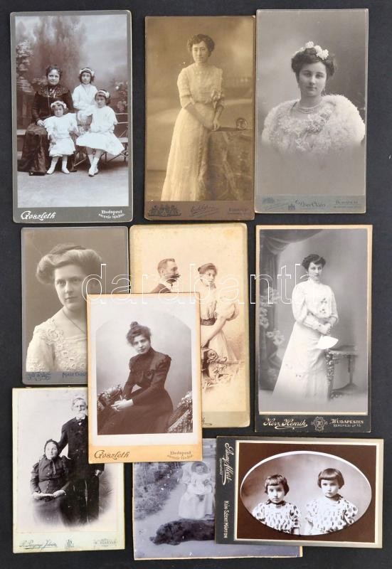 cca 1900 Vegyes keményhátú fotó tétel, portré és családi fotók, az egyiken kutyával, kettő kivételével mind feliratozva és nevesítve, 10 db, keményhátú fotók és egy fotó kartonon, Bp., Gosztleth (3 db), Uher Ödön, Herz Henrik, Erdélyi, Igló-Poprád, Matz Gusztáv, Szarvas, R. Rozgonyi István, Kunszentmárton, Sáray Albert műtermeiből, változó állapotban, 16x10 és 21x12 cm közötti méretben.
