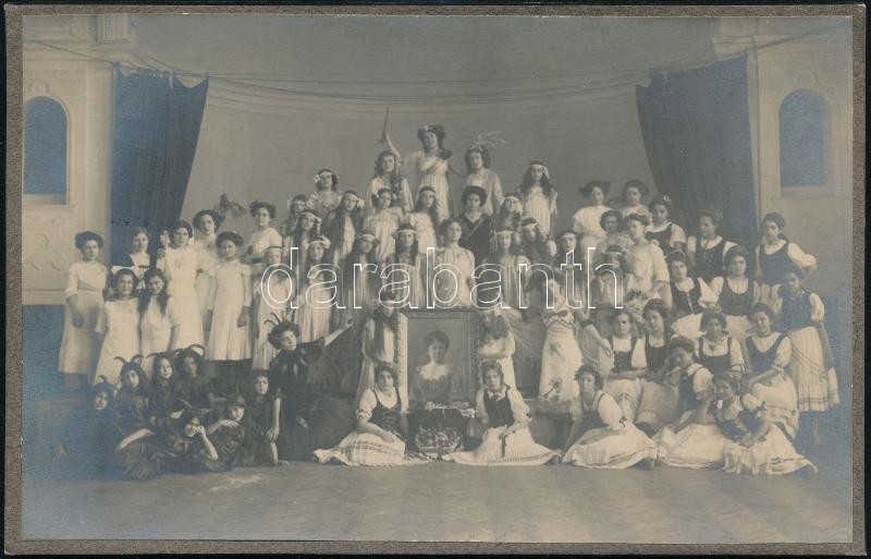 cca 1911 Matskássy Róza (?-1912) székesfehérvári felsőbb leányiskola (ma: Teleki Blanka Gimnázium és Általános iskola) igazgatónőjének 25 éves tanári jubileumi ünnepségén résztvevők csoportképe, Bp., Virág Sándor műterméből,10x16 cm.