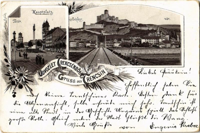Leírás: 1898 (Vorläufer!) Trencsén, Trencín; Fő tér, vár / main square, castle. Gansel L. Art Nouveau, floral, litho (EK)