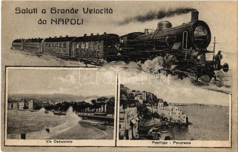 Leírás: Naples, Napoli; Saluti a Grande Velocitá da Napoli, Via Caracciolo, Posillipo Panorama / locomotive montage