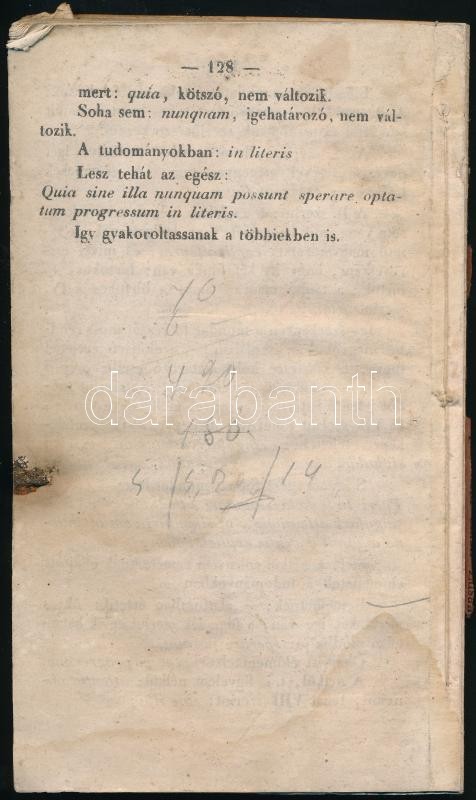 Leírás: Latin nyelvtan a magyarországi középtanodák használatára. első folyam. Budán. 1847. M. kir. egyetemi nyomda. Borító nélkül.