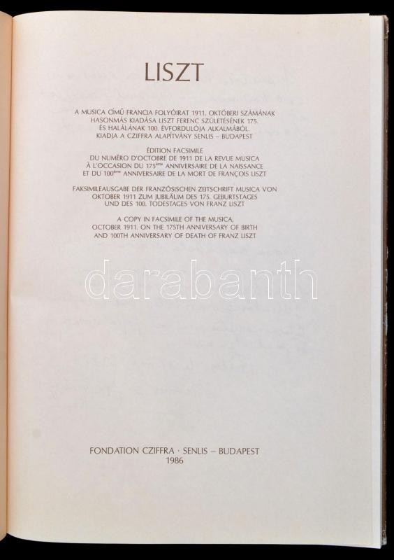 Liszt. A Musica c. francia folyóirat 1911. októberi számának hasonmás kiadása Liszt Ferenc születésének 175 és halálának 100. évfordulója alkalmából. Senlis-Bp., 1986, Cziffra Alapítvány. Több nyelven. Kiadói kartonált papírkötés, kiadói szakadt papír védőborítóban.