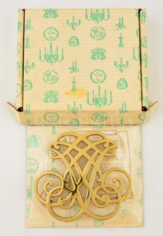 Leírás: Jelzett (Virgina Metalcraft) edény fém alátét, eredeti dobozában, 14×16 cm