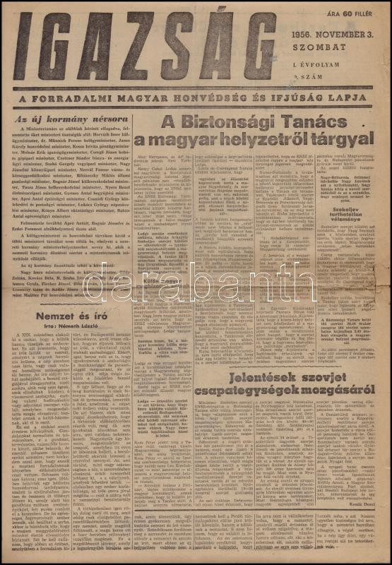 1956 Igazság. I. évf. 9. sz., 1956. nov. 3., szakadozott. https://www.darabanth.com/hu/351-Gyorsarveres/351.0/Mutargy-papirregiseg-egyeb/Nyomtatvanyok~500029/1956-Igazsag-I-evf-9-sz-1956-nov-3-szakadozott~II2001063