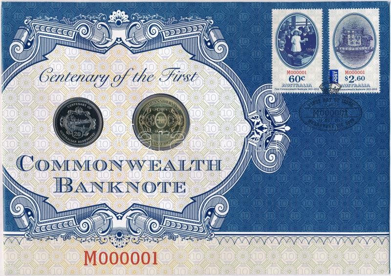 Australia 2013. 1 Dollar Al-Br "First banknote of Australia" + 2013. "Centenary of Australian Banknotes" comemorative medallion in envelope with stamps and FDC C:UNC