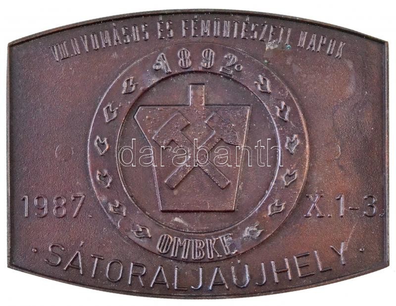 Leírás: 1987. "VIII. Nyomásos és Fémöntészeti Napok Sátoraljaújhely - OMBKE (Országos Magyar Bányászati és Kohászati Egyesület) 1892" egyoldalas fém plakett (108x82mm) T:2